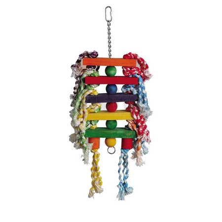 Dieses Vogelspielzeug besteht aus einem Metallstab, auf dem verschiedene Elemente aus buntem Holz und Seil aufgefädelt sind.